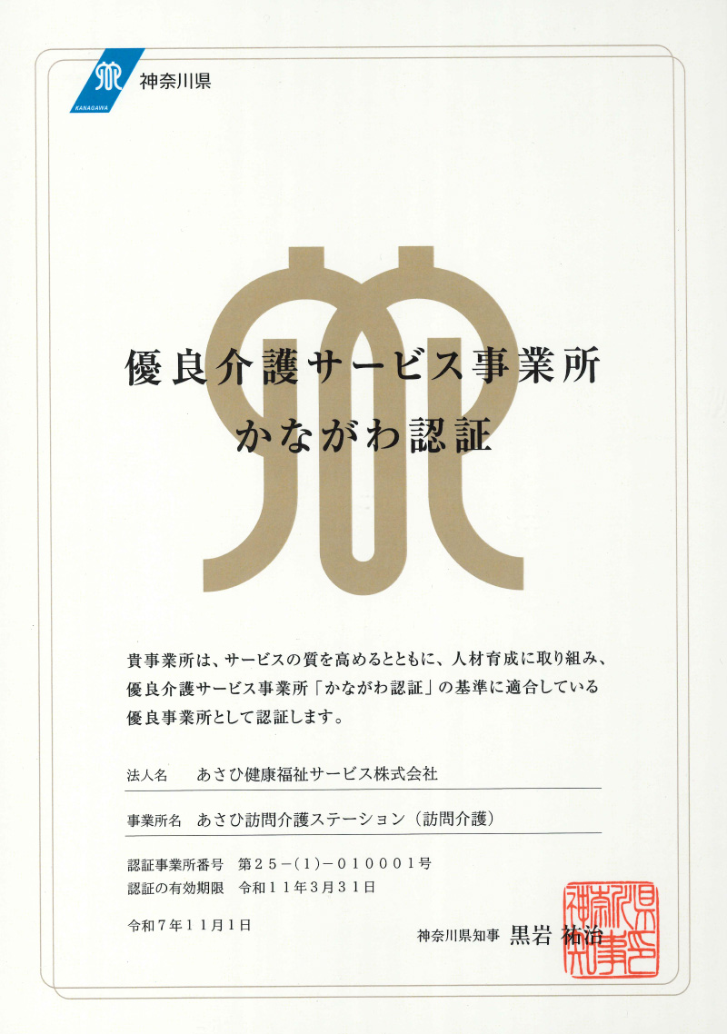 当事業所が優良介護サービス事業所「かながわ認証」を取得いたしました!